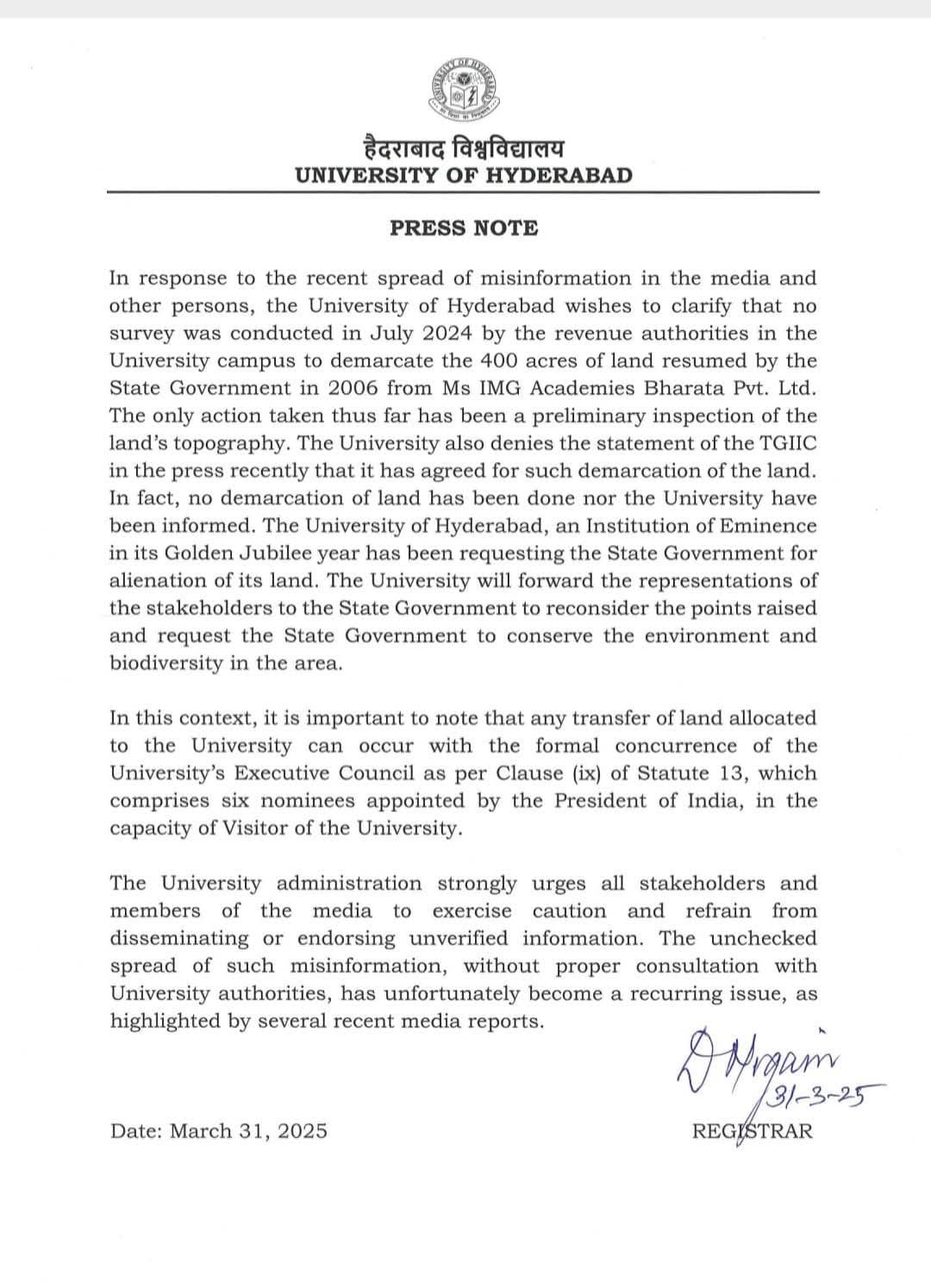 యూనివర్సిటీ మార్చి 31న,ఒక ప్రెస్ నోటును విడుదల చేసింది. అందులో 2024లో ఈ భూమికి సంబంధించిన ఎలాంటి సర్వే జరగలేదని, తనకు దానిపై ఎలాంటి సమాచారం లేదని స్పష్టం చేసింది. రాష్ట్ర ప్రభుత్వం చెప్పినట్లుగా తమతో ఎలాంటి భూవిభజన విషయంపై చర్చ జరగలేదని పేర్కొంది. అంతేకాదు, యూనివర్సిటీ భూముల అప్పగింపు కోసం విద్యార్థులు, పర్యావరణ కార్యకర్తల అభిప్రాయాలను ప్రభుత్వం పరిగణనలోకి తీసుకోవాలని విజ్ఞప్తి చేసింది. ఏమైనా భూమి మార్పిడి జరగాలంటే యూనివర్సిటీ ఎగ్జిక్యూటివ్ కౌన్సిల్ అనుమతి అవసరమని స్పష్టం చేసింది.