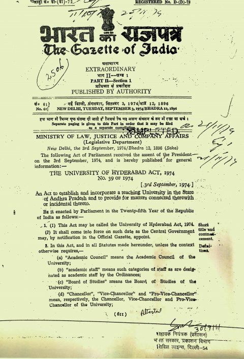 1969 తొలి దశ తెలంగాణ ఉద్యమంలో విద్యార్థుల నిరసనలతో అట్టుడికాయి. ఆ తర్వాత ఇందిరాగాంధీ ప్రభుత్వం 6 పాయింట్స్ ఫార్ములాని ప్రవేశపెట్టింది. అందులో 2వ పాయింట్ లో సెంట్రల్ యూనివర్సిటీ ని స్థాపించాలని ఆదేశించింది.1974 లో పార్లమెంట్లో చట్టం చేసి (యాక్ట్ నెం.39 ఆఫ్ 1974) ఈ యూనివర్సిటీని స్థాపించారు.