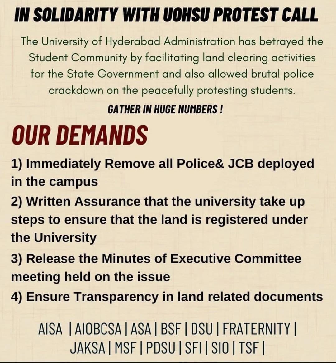 అర్ధరాత్రిల్లు బుల్లోజర్లు రావడం, అడవి జంతువులు ఉన్న ప్రదేశాలను చదును చేస్తుండగా నెమళ్ళు, ఇతర పక్షులు అరణ్య రోదనతో అరవటం.. అడ్డుకోవాలని ప్రయత్నించిన విద్యార్థులను లాఠీచార్జ్ చేయడం.. అరెస్టు చేయటం. ఇది సెంట్రల్ యూనివర్సిటీ ఆఫ్ హైదరాబాద్ పరిధిలోని ప్రాంతంలో జరిగిన సంఘటనలు.