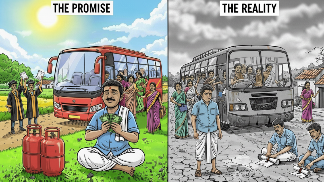 ఈ గణాంకాలను పరిశీలిస్తే, ప్రచారంలో చెప్పిన అంకెలకు, అధికారిక లెక్కలకు మధ్య ₹2.5 లక్షల కోట్ల నుండి ₹5 లక్షల కోట్ల వరకు వ్యత్యాసం స్పష్టంగా కనిపిస్తుంది. రాష్ట్ర ఆర్థిక పరిస్థితిపై ఇంత స్పష్టమైన అవగాహన ఉన్నప్పుడు, అమలు సాధ్యం కాని హామీలు ఎందుకు ఇచ్చారనేది మొదటి ప్రశ్న. ఇప్పుడు, తాము ప్రచారం చేసిన దానికంటే తక్కువ అప్పు ఉన్నప్పటికీ, “గత ప్రభుత్వం చేసిన అప్పుల వల్లే హామీలు నెరవేర్చలేకపోతున్నాం” అని చెప్పడం ద్వారా, ప్రభుత్వం ‘విక్టిమ్ కార్డ్’ ప్లే చేస్తోందని విశ్లేషకులు భావిస్తున్నారు.